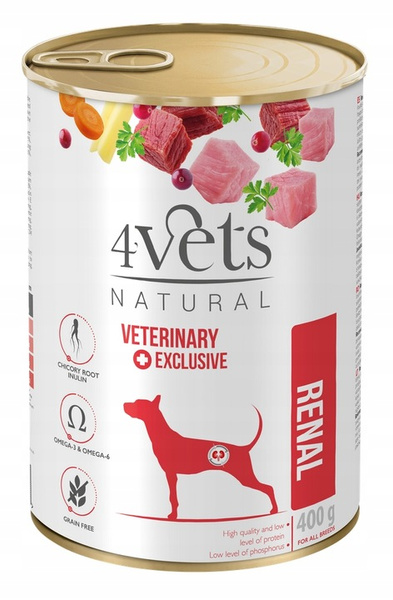 4VETS Natural Renal to pełnoporcjowa, bezzbożowa dieta weterynaryjna dla psów cierpiących na przewlekłą niewydolność nerek. Karma jest zaprojektowana z myślą o psach wszystkich ras, oferując specjalistyczne wsparcie dietetyczne, które może również być stosowane u psów starszych w ramach profilaktyki. Dieta zawiera obniżoną zawartość fosforu i sodu oraz ograniczoną ilość białka, co wspiera zdrowie nerek i pomaga w radzeniu sobie z objawami niewydolności nerek.